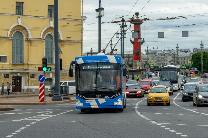 Троллейбус №7: начиная свой маршрут в Красногвардейском районе, пересекая р. Неву через красивейший Большеохтинский мост, далее следует через Центральный район с выездом на Невский и по нему до Дворцового моста и через стрелку Васильевского острова, транзитом, следует в Петроградский район.