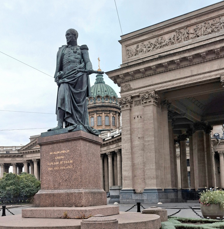 Два монумента, установленные перед фасадом Казанского собора, формируют единый мемориальный ансамбль, посвященный главным военачальникам Отечественной войны 1812 года.